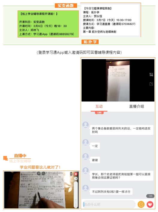 因为疫情不能返校,我的学习模式受到了较大影响,观看线上课程过程中产生疑问也难以像在教室里一样及时解决。在这种情况下,学长们通过直播课的方式为我们答疑解惑,清理了知识盲区,也解决了一些关于实变函数的问题。除了答疑,还会适当拓展,挑选经典例题或题型让我们深入了解知识。另外,作为学生更清楚我们在学习中会遇到哪些问题,也更擅长运用网络平台分享学习资料。针对我们遇到的问题,能用我们可以接受的理解方式让我们明白;对于学习资料,他也能通过多种方式分享给我们。如果你在学习过程中遇到了什么问题,不妨来他的直播中寻找答案吧!