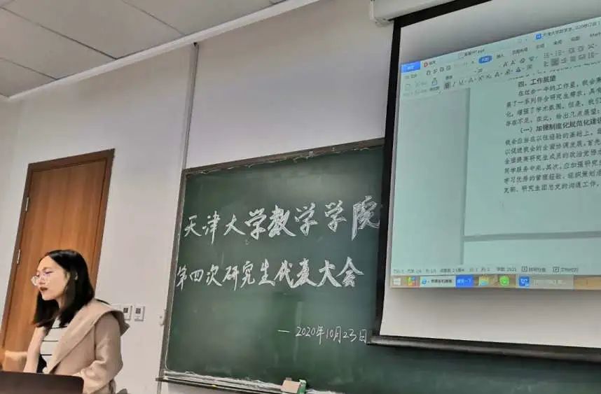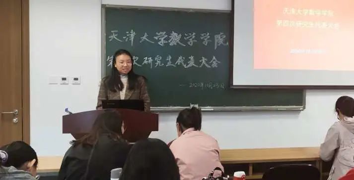 2020年10月23日下午3时,天津大学数学学院第四次研究生代表大会于北洋园校区32教学楼B518教室召开。本次大会由学院学工办主任唐婧亚主持,11名研究生代表以及研究生会2名主席团候选人出席会议。