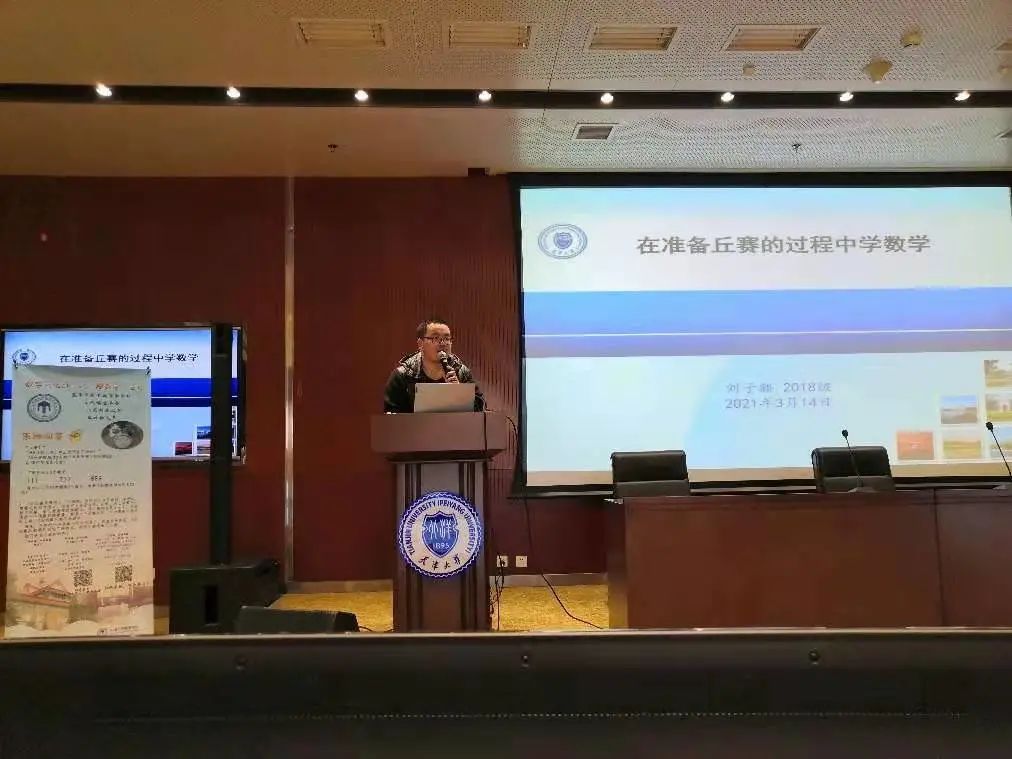 刘子麒以《在准备丘赛的过程中学数学》为题,分享学习体会。他以切身经历,建议同学们一是抵住电子产品的诱惑,做好时间管理,保持勤奋的学习状态。二是多方面获取资源,坚持主动自学,学会对自己负责,日积月累,一定会有收获。在给出推荐的学习书目后,他为大家加油鼓劲,“无论参赛结果如何,希望你我能始终保持对数学的热情!”