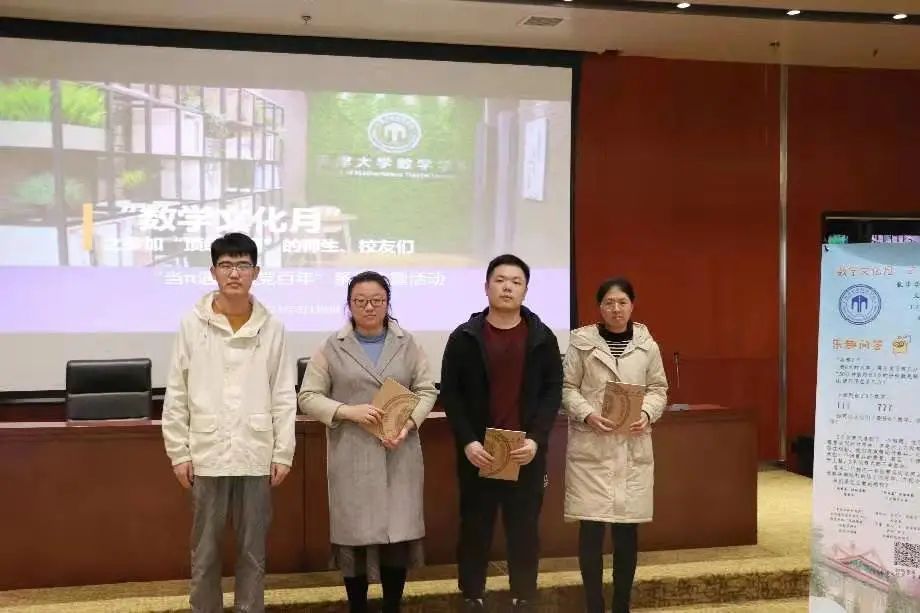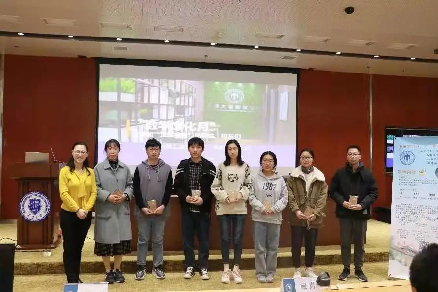 为感谢校友对师弟师妹们的指导,许晶为张况颁发天津大学数学学院“英华导师”聘书。老师、校友共同为“数学文化月”之“趣数学”活动获得一、二、三等奖的学生代表颁奖,鼓励大家志存高远,为学好数学砥砺前行。