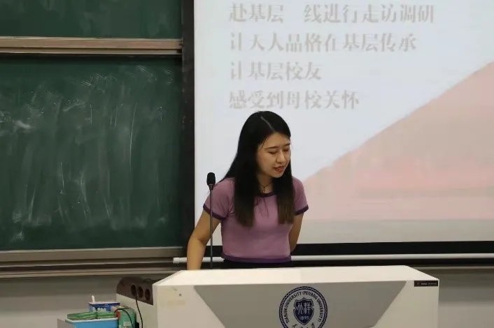 刘心韵介绍2021年暑期学院举办的“胸怀家国 寻梦立志”名企行系列活动,以及2021年毕业季数院研会的系列工作。她讲到,迎新季不到十人的策划、执行团队,出品了一个1万+浏览量的迎新季视频,视频也得以被“天津大学”官方微博转载,足见每位同学潜力巨大。数院研会历届负责人的经验分享,也从一个侧面揭示出,数院人可以在学术科研、学生工作、热心助人等多方面共同成长,做德智体美劳全面发展的数院人。她欢迎同学们加入数院研会,共同为数学学院培养素质高、能力强的数院人贡献力量。纪璇介绍公研会服务同学的各项举措,展示基层校友的工作点滴,她表示公研会希望带领天大人共同增强对时事政治的学习理解力,通过“青苗工程”“励行计划”等品牌活动,加强感恩奉献的品德塑造,提升在校生的职场胜任力。