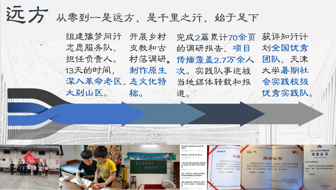 我和来自多所高校的同学组建了一支“野生”实践队——豫梦同行实践队,并担任负责人。深入革命老区大别山区开展为期两周的支教和古村落调研活动,完成2篇累计70余页的调研报告,项目传播覆盖2.7万余人次。相关事迹被当地媒体转载和报道,获评知行计划全国优秀团队,天津大学优秀实践队,作为实践队代表参与年度成果发布会。为弥补短期支教缺乏的传递机制,我们在当地建立梦想教室,从1到N,新的团队将载着初心继续豫梦同行。