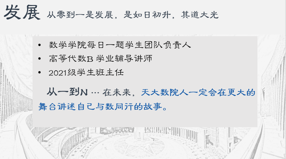 连续两学期担任学生负责人,发布每日一题264期,覆盖数学专业所有核心课程;担任高等代数学业辅导讲师,解人之惑亦解己之惑;担任学生班主任,在一年级开设专业课程讨论班,做引路人,引航人…路漫漫其修远,基础学科的强大靠一代代人才的积淀,我很荣幸能为数院的蓬勃发展贡献力量,也相信,从一到N, 天大数院人一定会在更大的舞台讲述自己与数同行的故事。