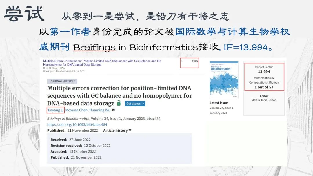 去年10月,我以第一作者身份完成的论文,被国际数学与计算生物学权威期刊接收,影响因子13.994 。一路走来,我做了很多从零到一的尝试。15个月的时间,从学习新知识,诞生idea再到完成论文,我经历了严格的学术训练。从1到N,我将赴中国科学院深造,立志于解决AI For Science 时代重大数理基础问题,我们必须知道 我们也终将知道。