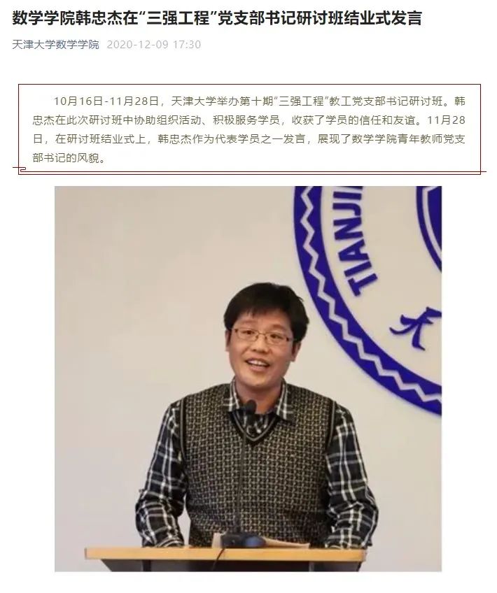 韩老师不仅是数学学院的教师,同时还是天津大学数学学院应用数学教师党支部的书记。在其位谋其事,韩老师不仅出色地履行作为一名支部书记的职责,为数学学院基层党建工作奉献着自己的光与热;同时,老师也无时无刻不对我们进行思想教育和指引。他要求我们要明大德,辩是非,感号召,希望课题组成员可以在自己的支部为党旗添彩,为党徽增光。