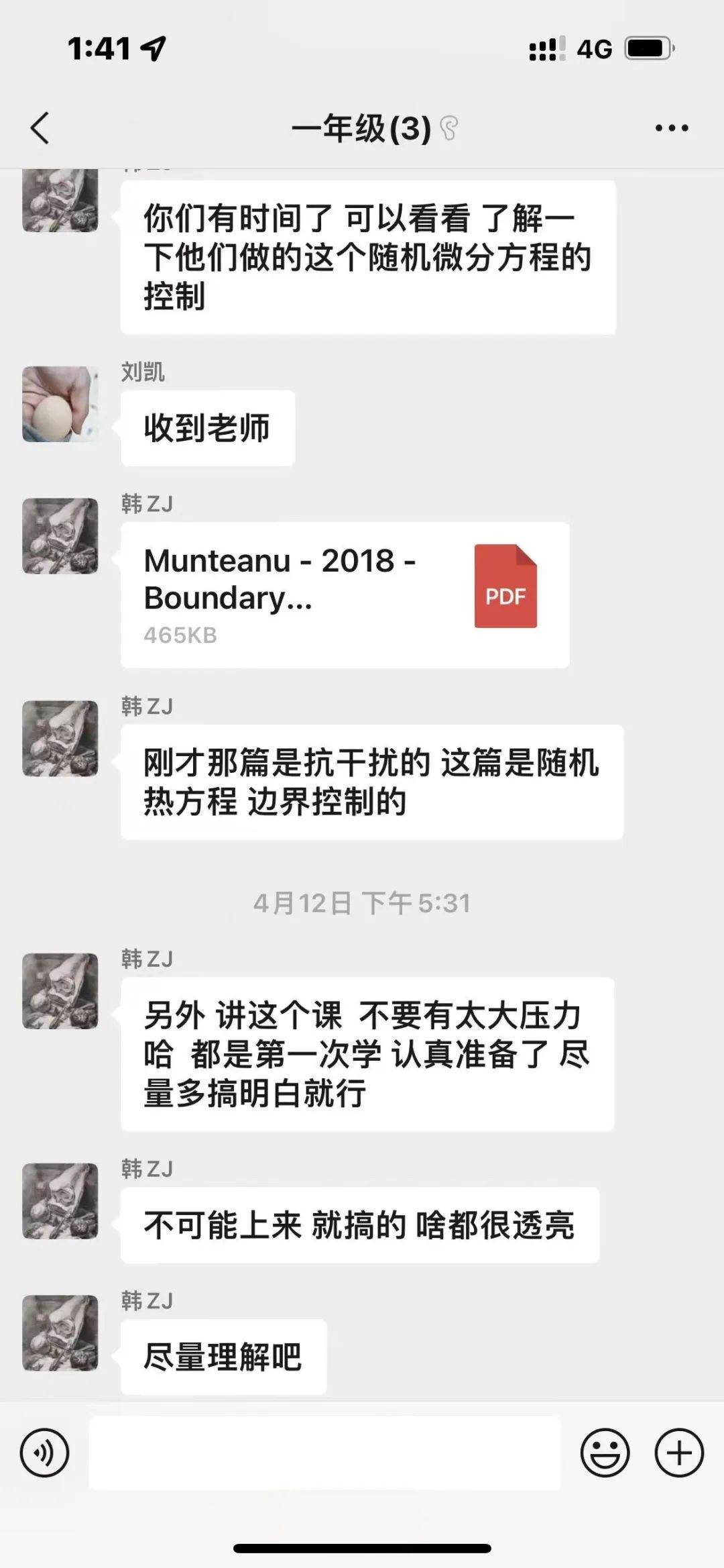 韩老师经常告诫我们要脚踏实地做科研,认认真真的生活,“不要假努力,一坐坐一天但是什么也没学到,让自己做事的效率一点点提高起来”。在学术方面,老师始终保持着严谨认真的态度,言传身教,确保学生对科研中的每个细节都清楚掌握。韩老师还会以身作则,带领大家一起钻研知识,在每周两次的讨论班上全程参与,与大家一起探讨新知识。“我们怎么更形象地理解这个定理”、“这个不等式有没有一些具体应用”,在一次次的讨论中,大家对陌生与抽象的定理与定义的理解更加深入。