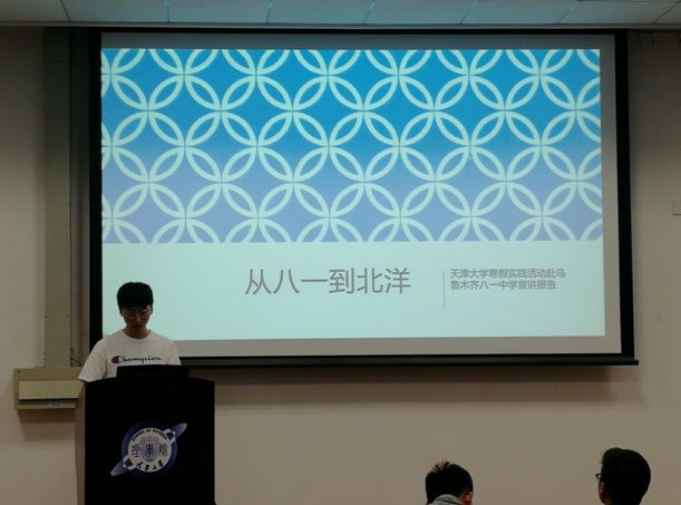 随后上台展示的2017级数学1班刘子沐同学带领的“青年湖咸鱼”实践队,详细展示了在母校乌鲁木齐八一中学的回访活动。他们前期进行了充分的调研,后期进行了多元化的联合宣讲,对针对有意愿报考天大的同学进行了细致的答疑。薪火相传,追梦北洋,他们用自己的方式阐述了对天大和中学母校的热爱。