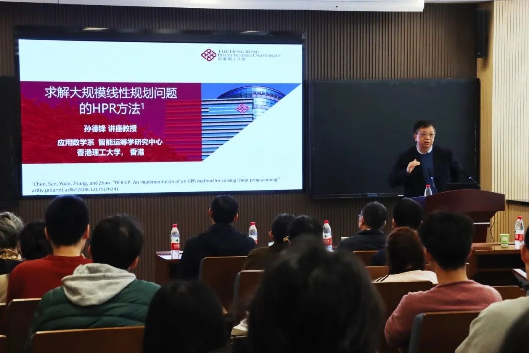 2024年11月16日上午,香港理工大学应用数学系系主任和应用优化与运筹学讲座教授孙德锋做客天津大学数学学院,在58教414报告厅做主题为“求解大规模线性规划问题的HPR方法”的报告,带领我校师生探寻如何高效解决超大规模线性规划问题。数学学院院长孙笑涛主持本次活动。