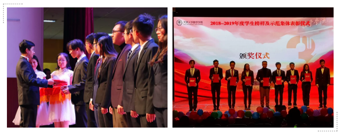 为表彰先进,树立典型,激励广大学子成长成才,本次活动首先进行了学院学生榜样、师范集体的表彰总结环节。授予2018级数学与应用数学本科2班等10个集体“数学学院示范集体”荣誉称号;授予陈章玲等13名在学习科研、自立自强、学科竞赛等方面表现突出的同学 “数学学院学生榜样”荣誉称号。党委副书记许晶代表宣读表彰决定。党委书记马德刚、副院长刘娜分别为2019年度学生榜样及示范集体获奖学生代表颁奖。