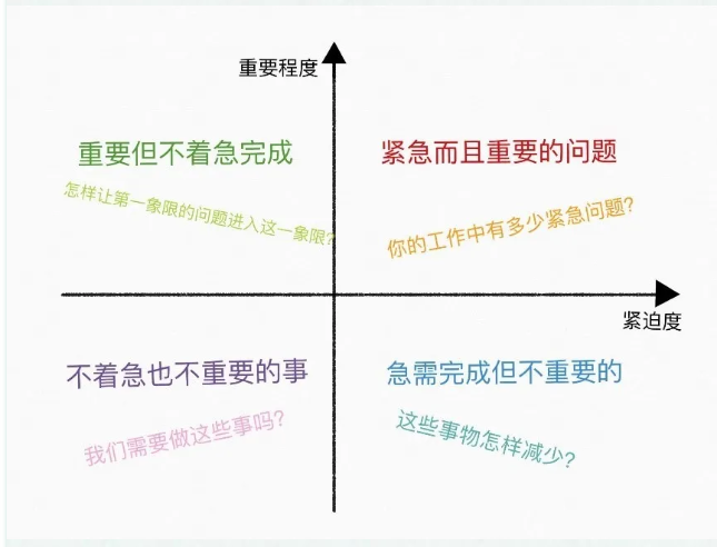 如果把要做的事情按照紧急、不紧急、重要、不重要的排列组合分成四个象限,这四个象限的划分有利于我们对时间进行深刻的认识及有效的管理。