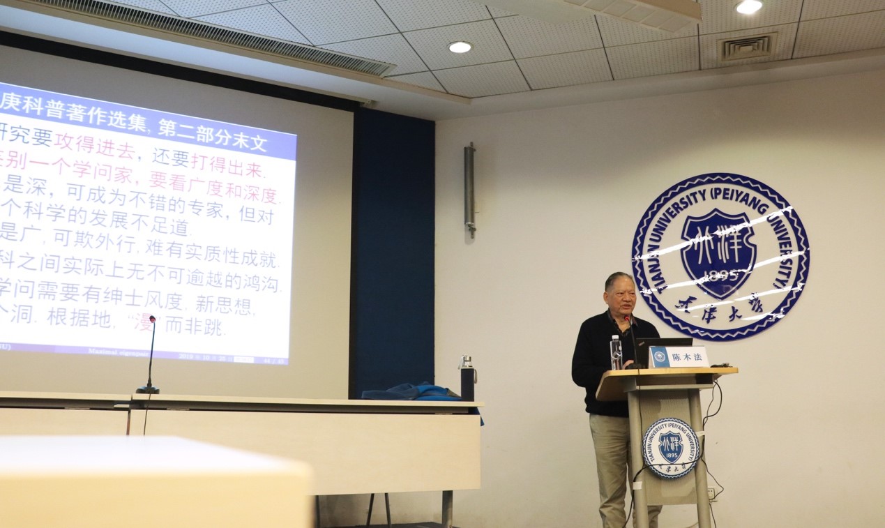 On October 25th, Professor Chen Mufa, academician of CAS was invited into Tianjin University to share his experience and understanding of crossover research with young scholars and students on a main line of exploring the calculation of the eigenvalues and eigenvectors of matrices.