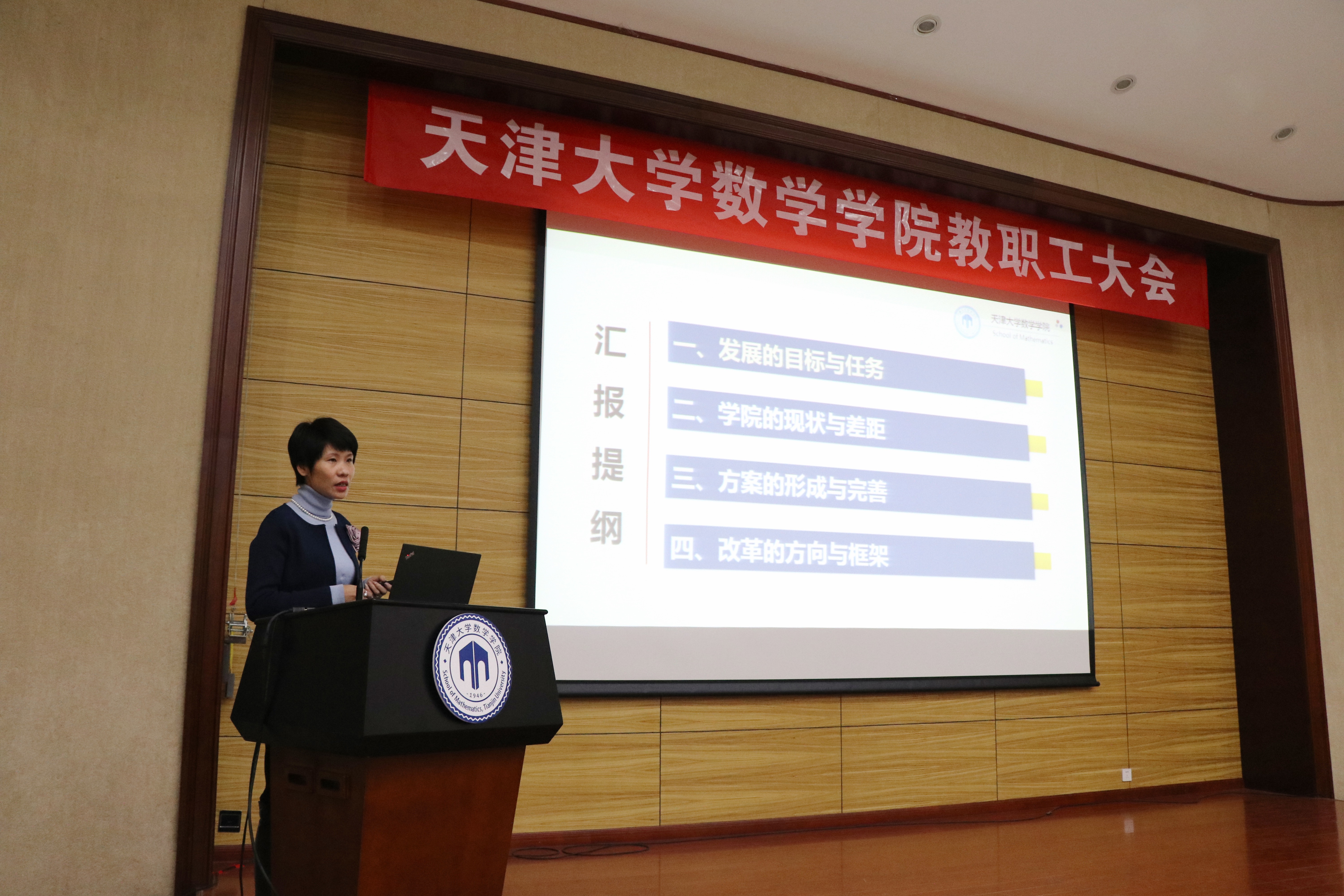 On the afternoon of December 15, 2017, the first faculty conference of the School of Mathematics was held in the report hall of the science library of Tianjin University. The leaders from the School of Mathematics and the faculty members from the School of Mathematics attended the conference. The conference was presided over by Sun Xiaotao, dean of the School of Mathematics.
